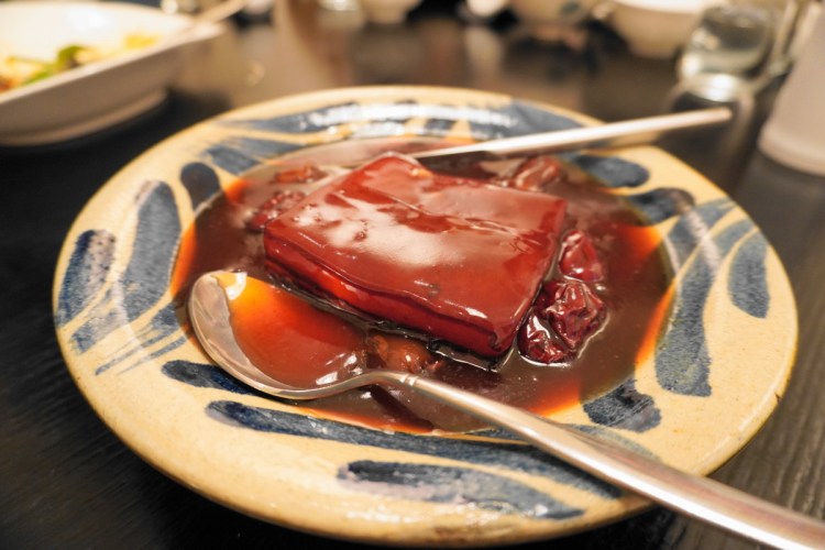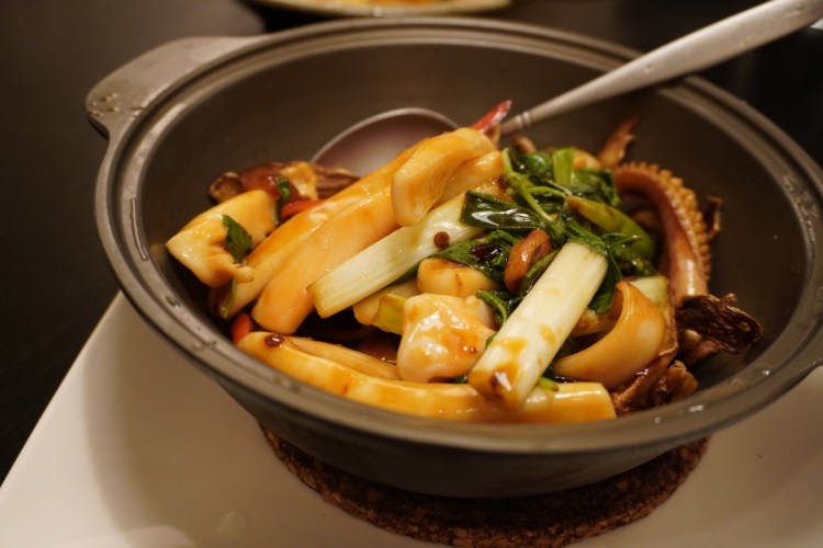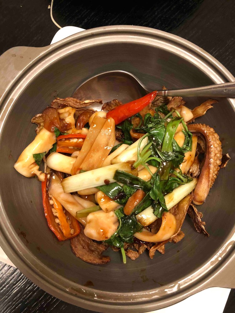 問了服務人員這邊最知名的是哪一道菜?他說就是干貝竹笙雞湯這道,上桌時用鑄鐵鍋煮過裝盛雞肉果然非常的透,香味真的濃郁!但已經吃了快兩個小時了,上菜速度實在太久,實在覺得味道太鹹以外,乾貨泡開的干貝有種陳年的味道,實在不愛!